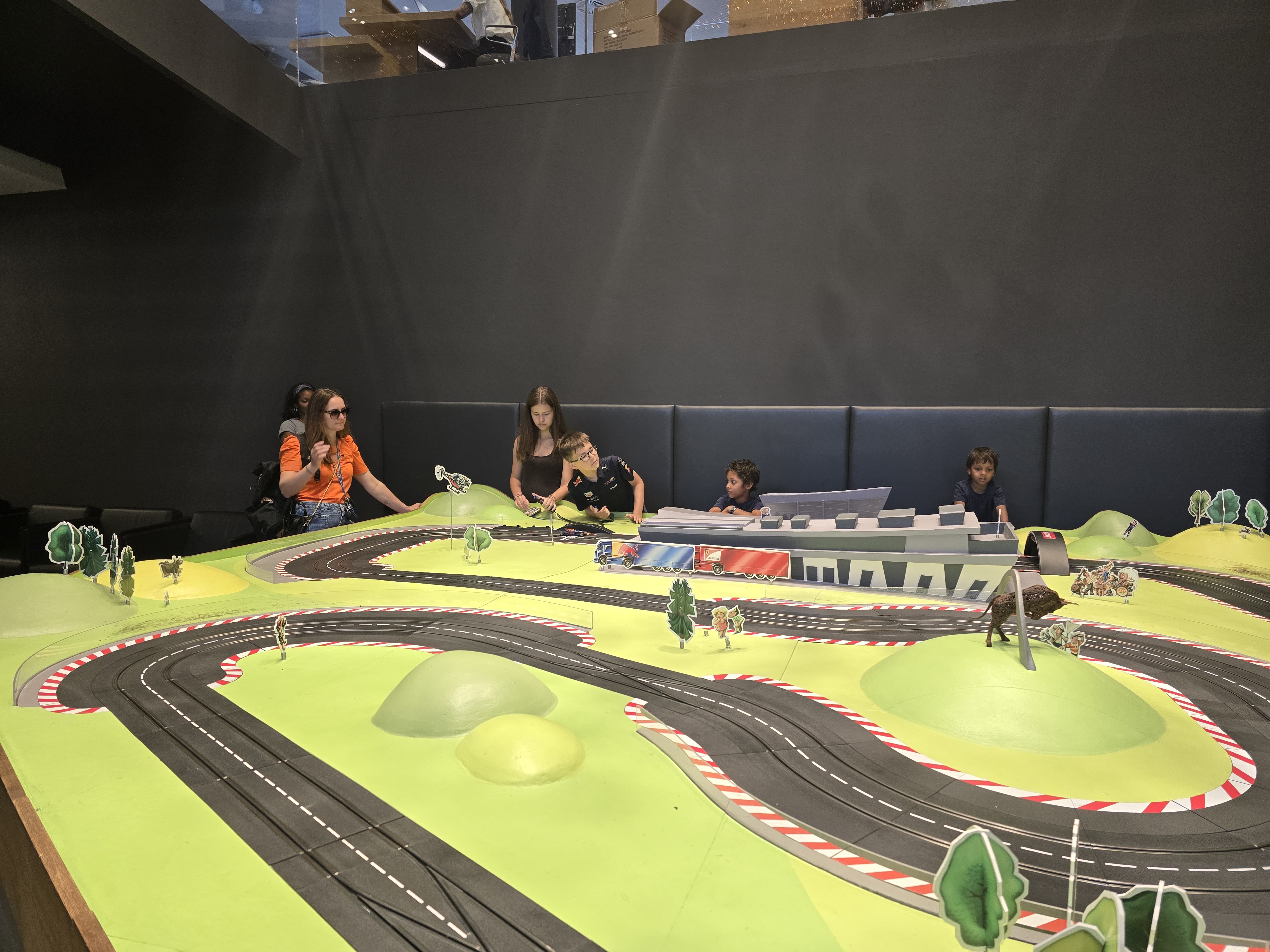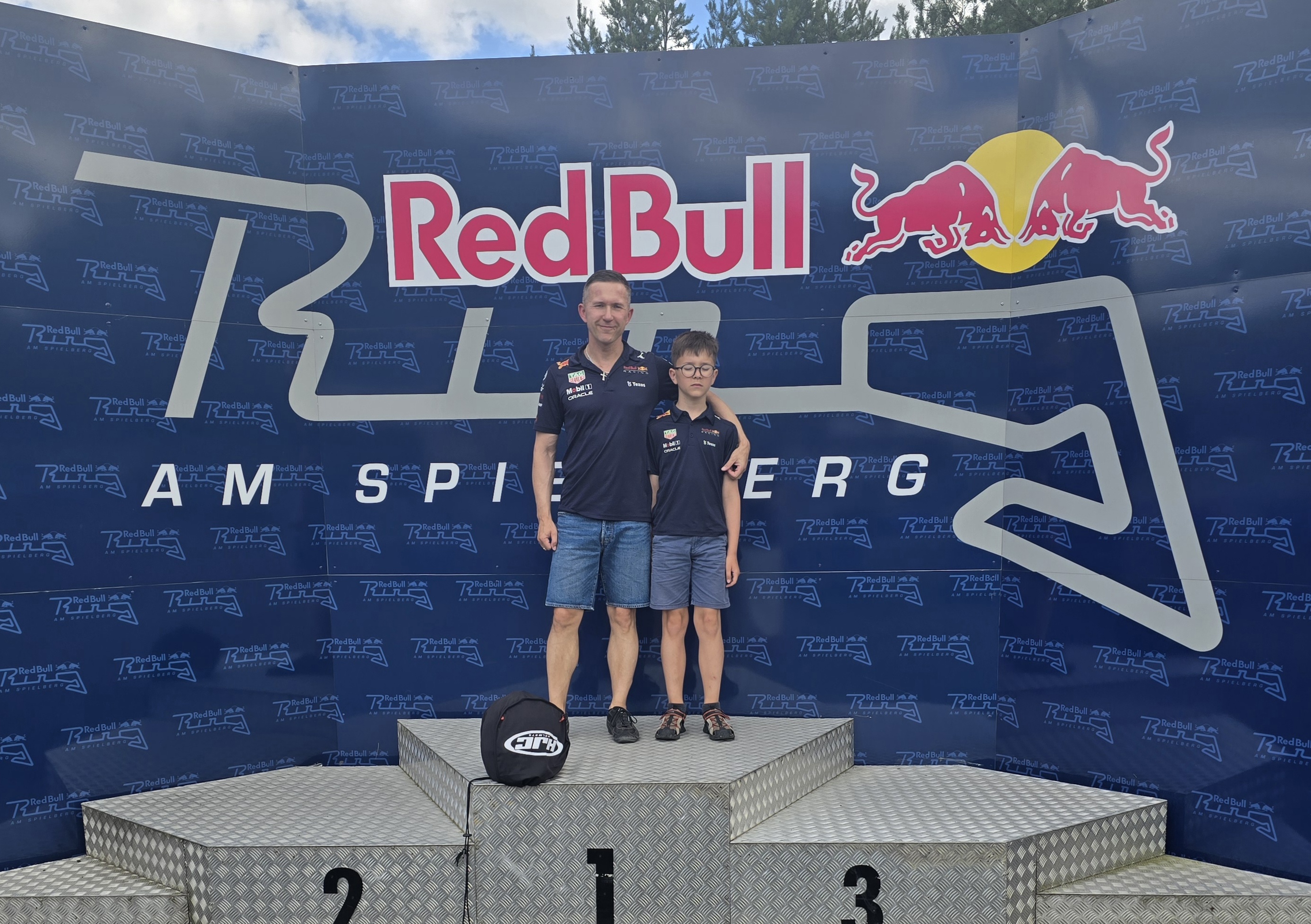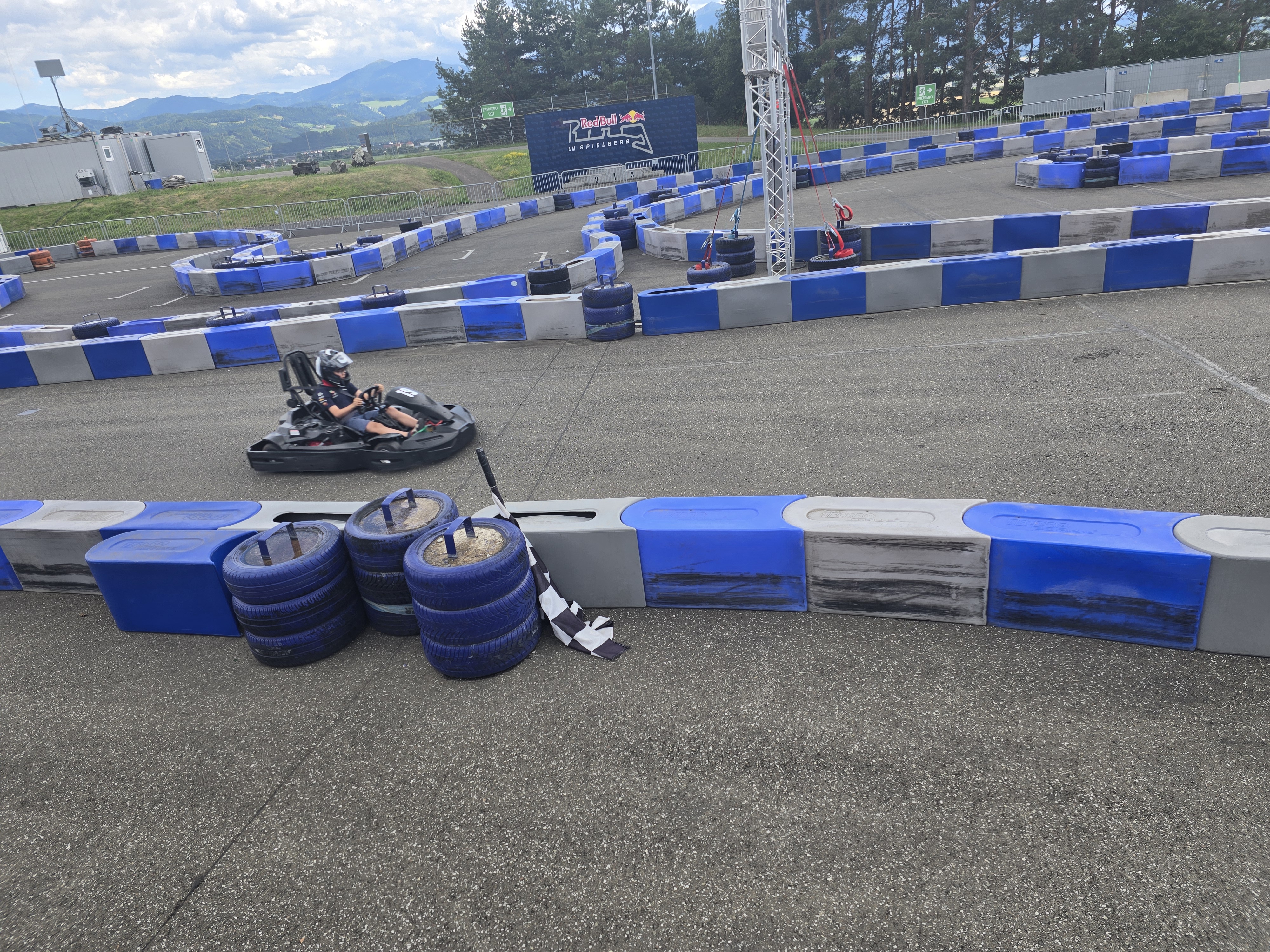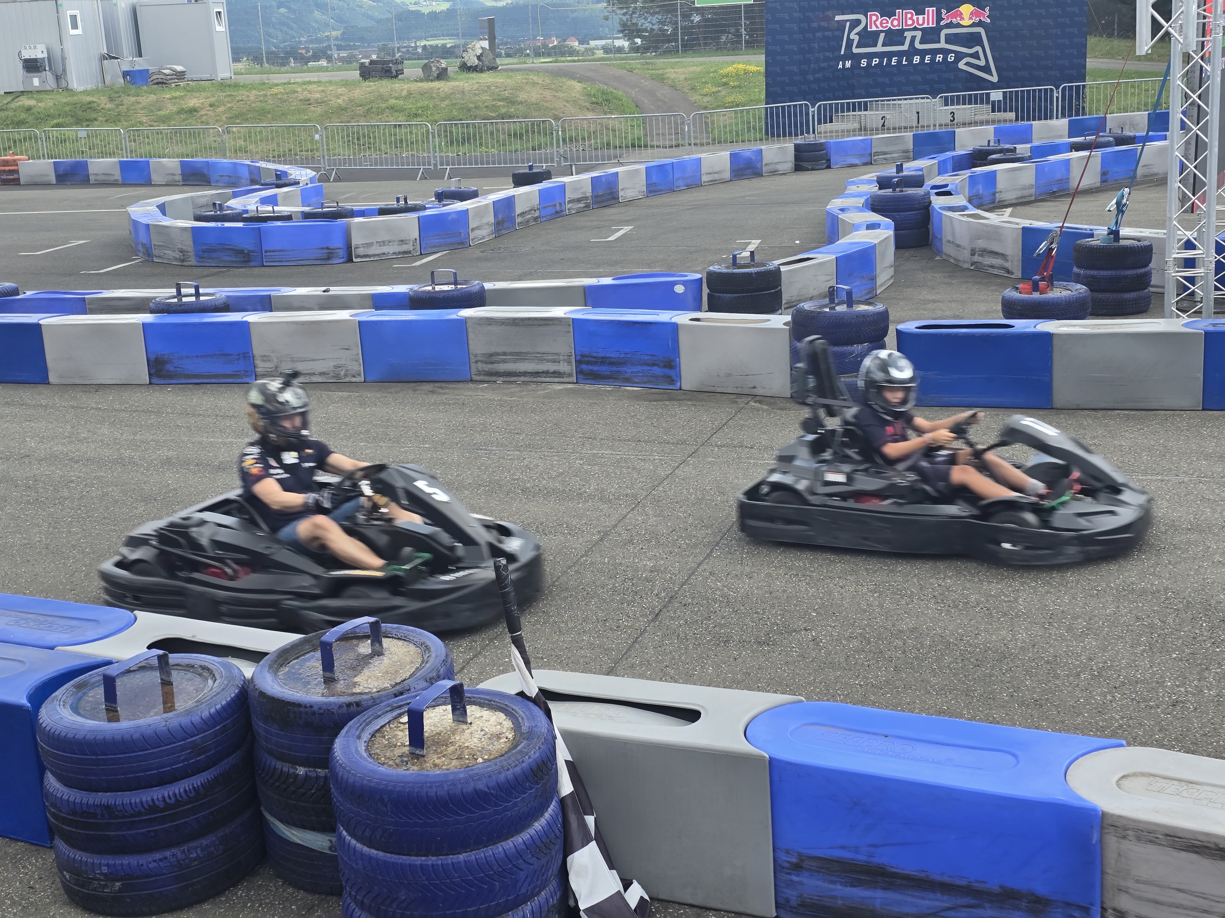 O ile jednak w Portimao mamy karting z prawdziwego zdarzenia i miałem tam okazję pojeździć nawet pro rotaxem (ok nie miałem do dyspozycji pełnej nitki, co było pewnym rozczarowaniem, ale nadal było "ok"), o tyle niestety w przypadku RBR mamy tę atrakcję doklejoną tak jakby na siłę. Nie uświadczymy tu naturalnej asfaltowej nitki, a jedynie trasę wytyczoną przez baloty na asfaltowym placu. Siłą rzeczy to już mocno ogranicza potencjał tego miejsca, bo takie tory są zwykle dość nudne (brak opcji zrobienia tam fajnych wstawek typu rampy, banking etc.). Zwykle też brakuje kombinacji szybkich zakrętów i tak było też tutaj. Szczerze powiedziawszy trudno wiele więcej napisać - nitkę możecie obejrzeć na nagraniu zarówno z kasku, jak i z zewnątrz. Nie była tragiczna, ale nie było w niej nic atomowego. Podobnie wózek - jechał, ale jakoś bez większego animuszu, prowadzenie średnie (akurat mój lekko ściągało). Pojechałem 20 minut z rzędu i bez żalu opuściłem obiekt. Marcel jechał juniorem 10 minut (mimo odpowiedniego wzrostu nie mógł jechać seniorem, gdyż ten jest od 12 lat), więc oczywiście był niepocieszony tempem. Razem zapłaciliśmy 60 euro, więc jak na Austrię bez tragedii, ale relacja jakość/cena i tak nie powaliła.